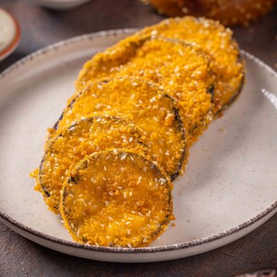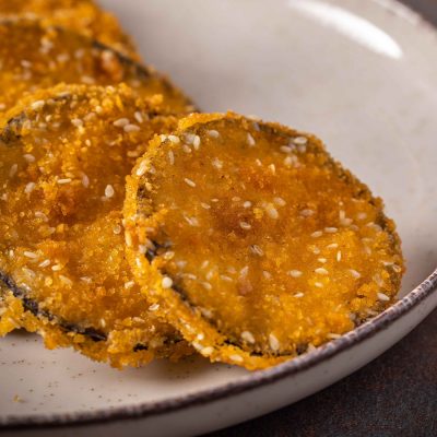 פרוסות חציל מצופות פירורי לחם ושומשום לבן, מטוגנות בשמן…