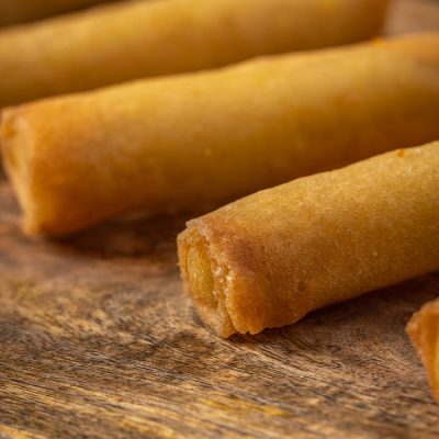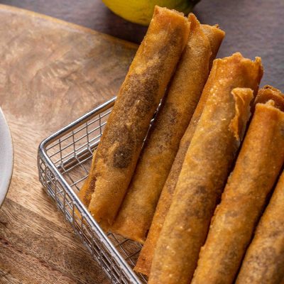 עלי פילאס ממולאים בירקות מוקפצים, מטוגנים בשמן עמוק. מנה…