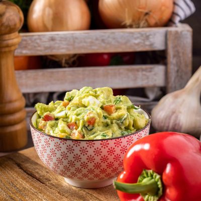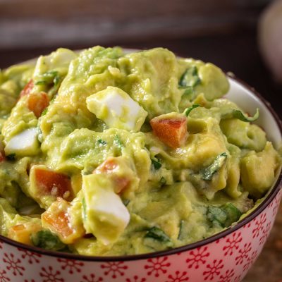 סלט אבוקדו מתובל בלימון וביצים. נחטף עם טורטייה עוף.