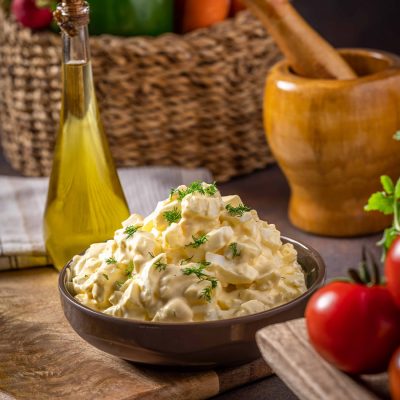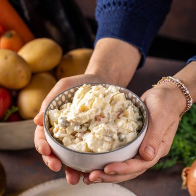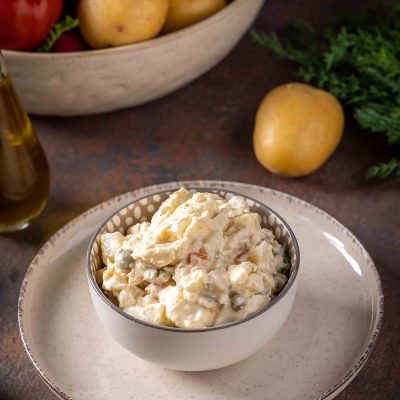 סלט תפו”א וביצים עם מלפפון חמוץ ומיונז.