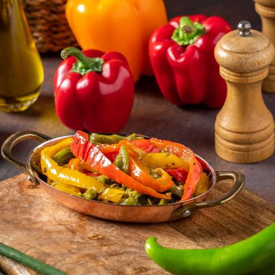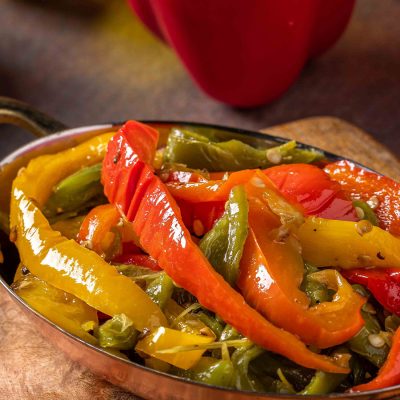 סלט פלפלים קלויים בכל הצבעים. מצויין ליד כל מנת…