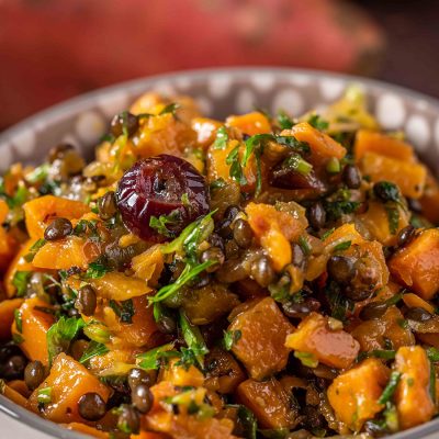 בטטה מבושלת רכה עם עדשים חומות מבושלות. סלט צבעוני…