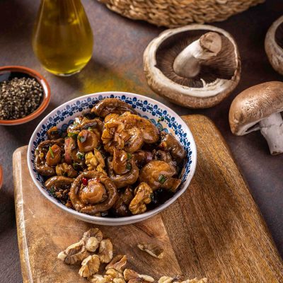 פטריות טריות אפויות בתנור, מוקפצות עם רוטב צ'ילי, אגוזי…
