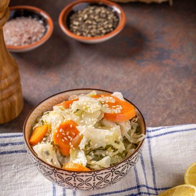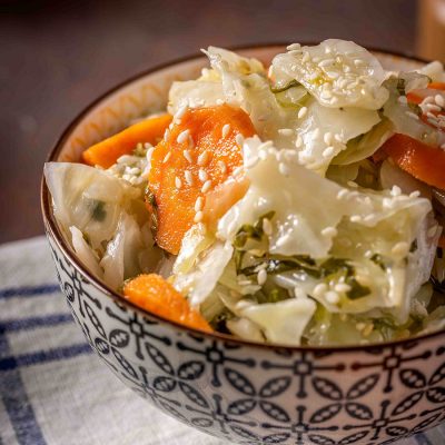 רצועות כרוב עם עלי סלרי במרינדה מתוקה ושומשום קלוי.…