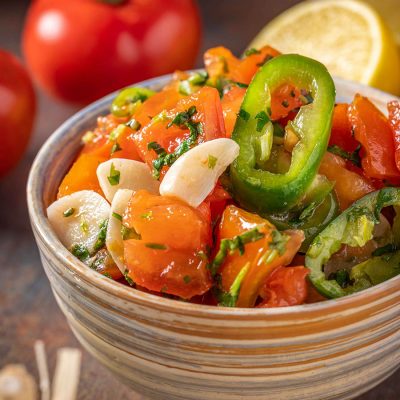 קוביות עגבניות טריות, שום, פלפל חריף בשמן זית, לימון…