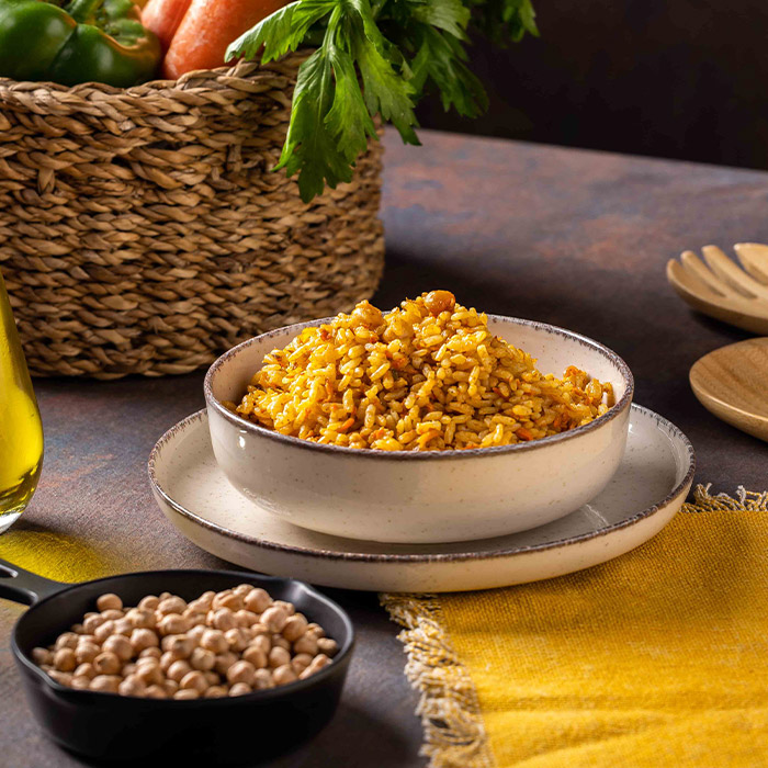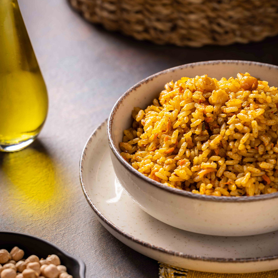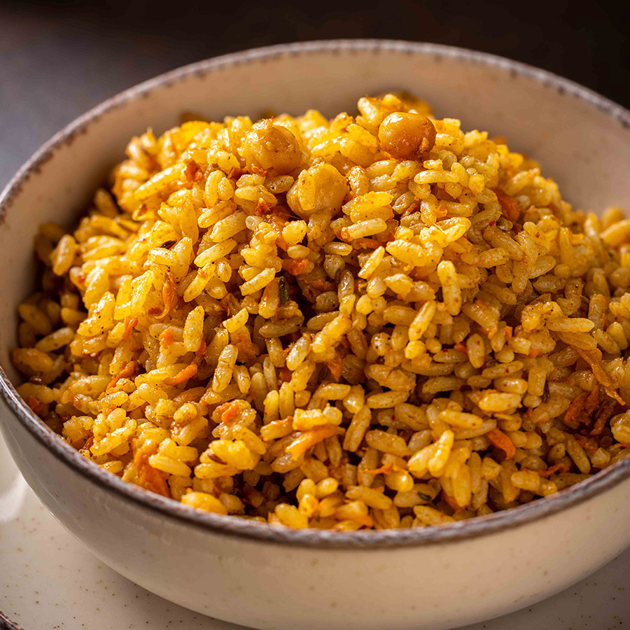 אורז עגול בוכרי בליווי גרגירי חומוס מבושלים ונימוחים, גזר ובצל מטוגנים ומתקתקים.