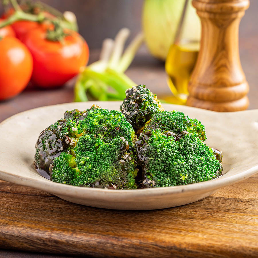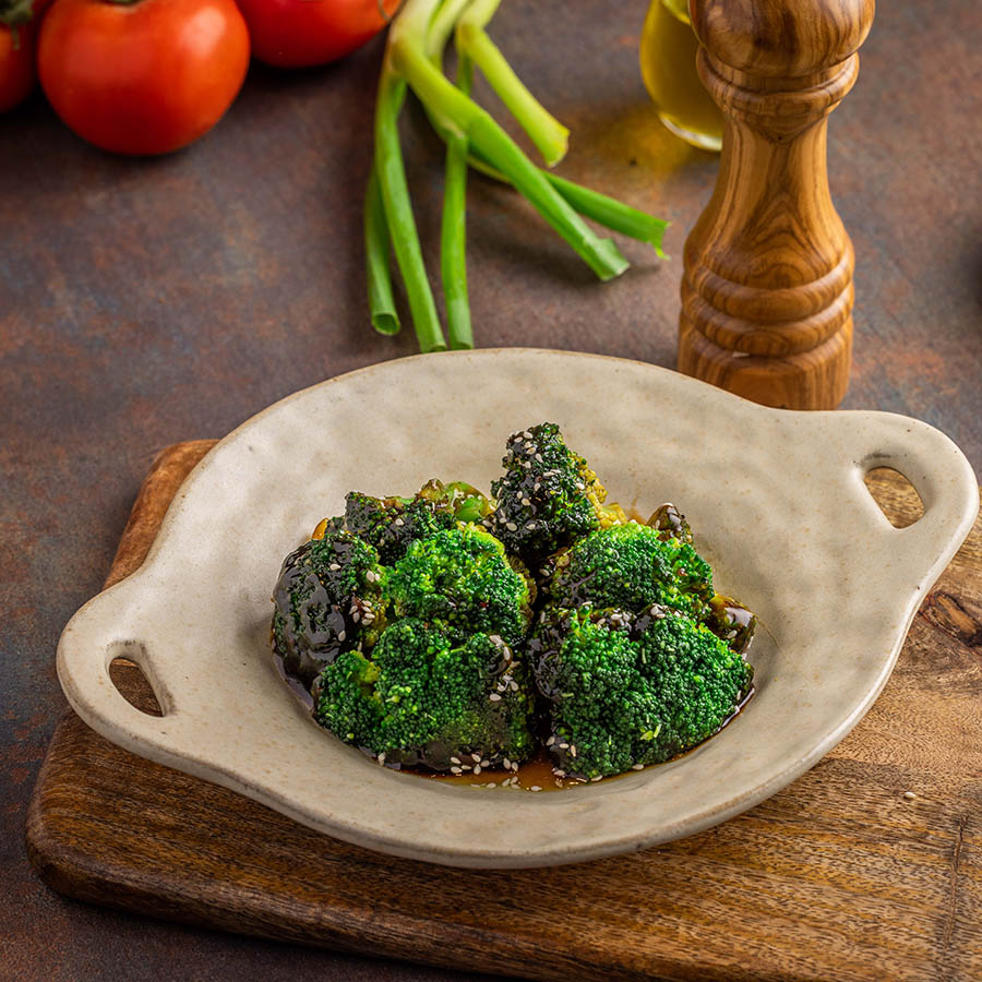 ברוקולי אפוי בתנור, מזוגג ברוטב טריאקי ושומשום מוקפץ.
