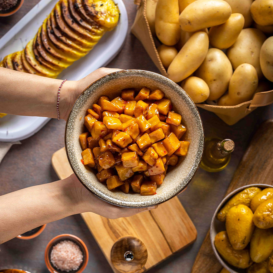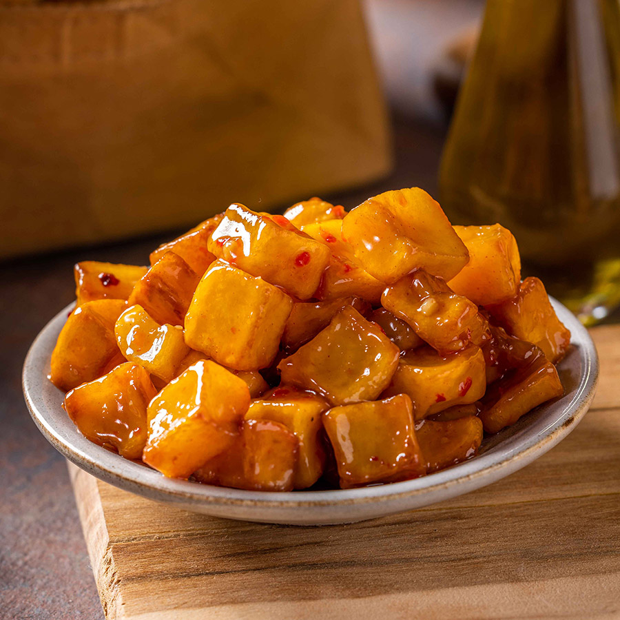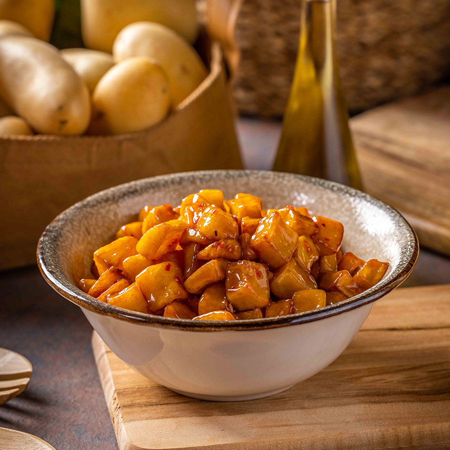 קוביות תפוחי אדמה רכים ברוטב צ’ילי מתקתק.