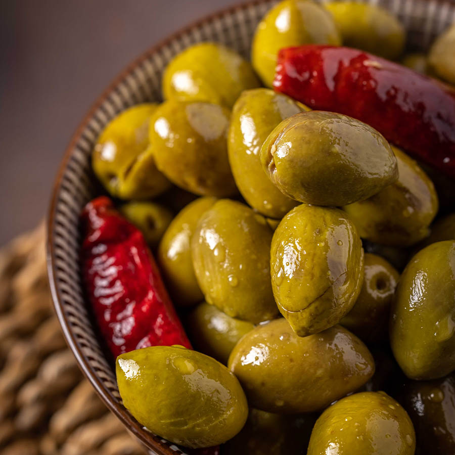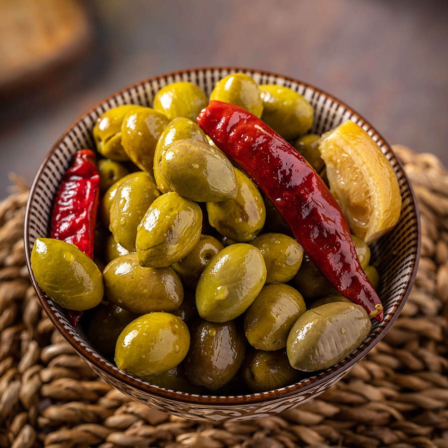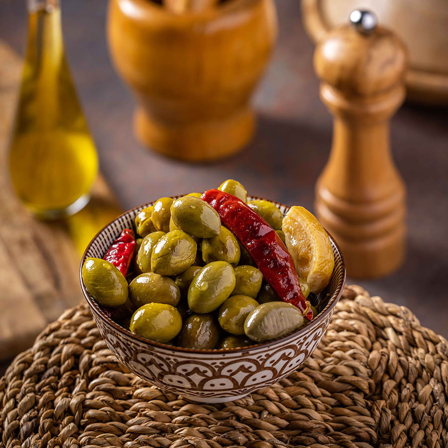 זיתים סורים מבוקעים ומתובלים עם פלפל חריף