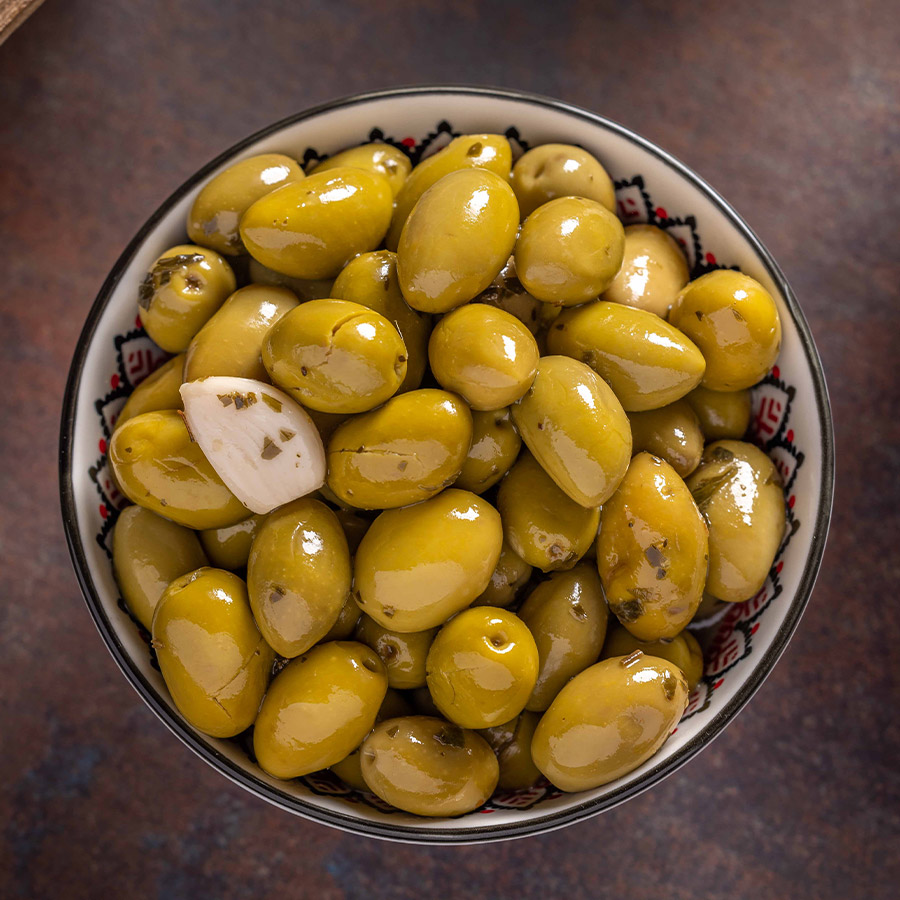 זיתים ירוקים כבושים מתובלים בשמן זית, שום ושמיר