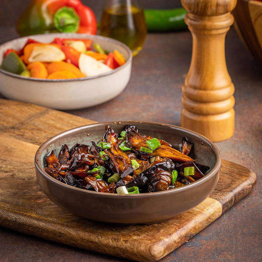 סלט חציל בליווי רוטב טריאקי וצ’ילי בסגנון אסייתי, חרפרף ומתקתק.