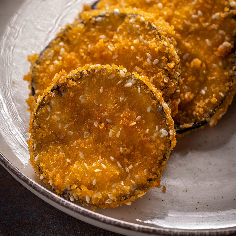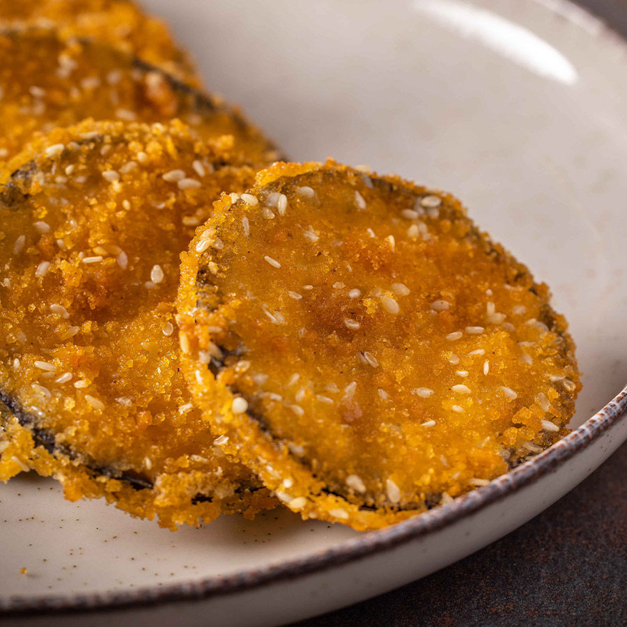 פרוסות חציל מצופות פירורי לחם ושומשום לבן, מטוגנות בשמן עמוק.