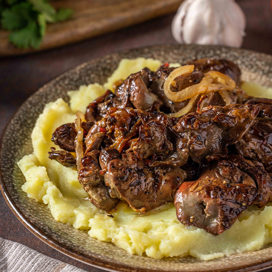 כבדי עוף מקורמלים עם בצל ויין אדום.