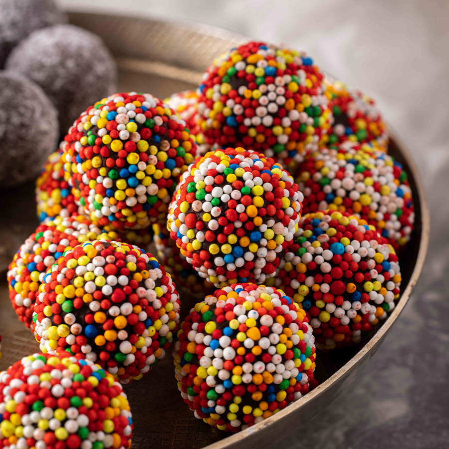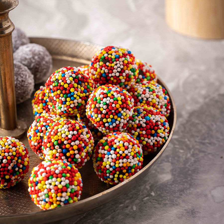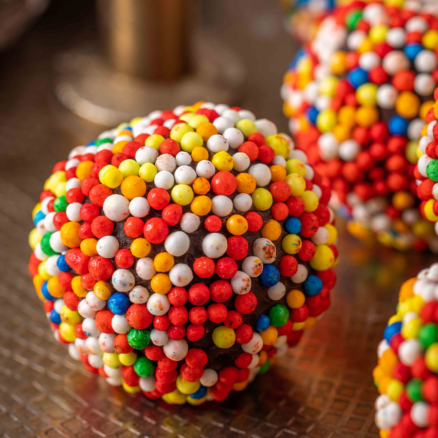 כדורי שוקולד רכים מצופים סוכריות צבעוניות.
