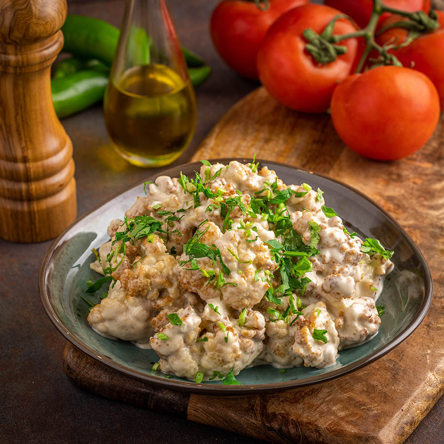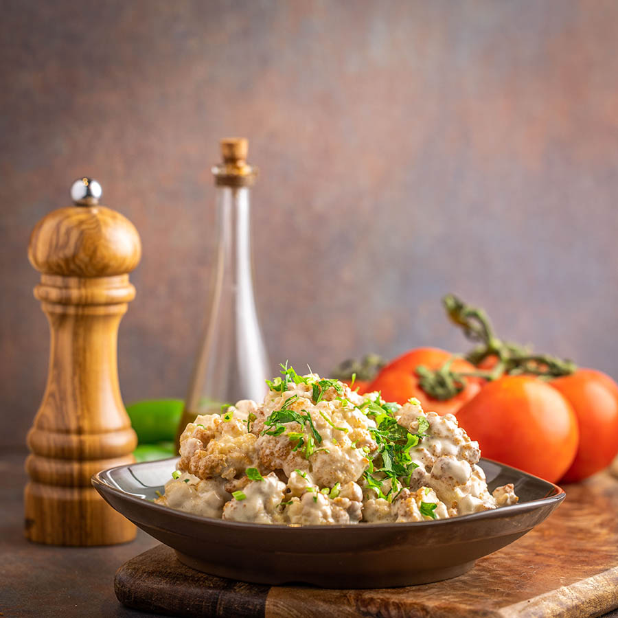 נימוחה ורכה מונחת על טחינה מתובלת טרייה.
