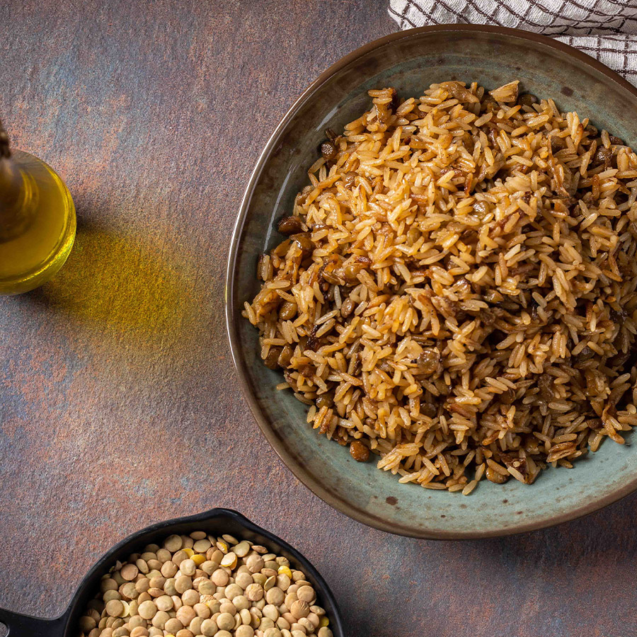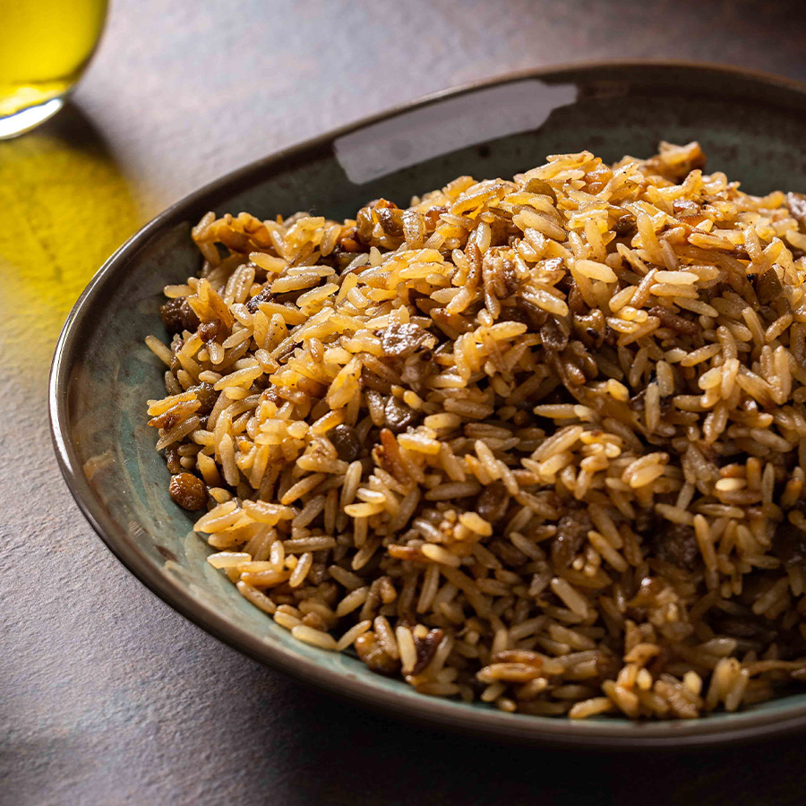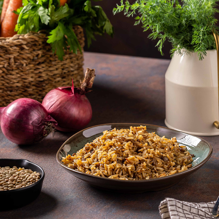 אורז פרסי רך מבושל עם עדשים ירוקות, עמוס בצל מטוגן מתקתק.