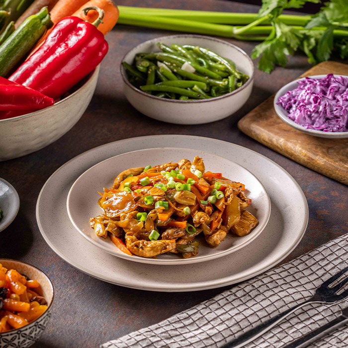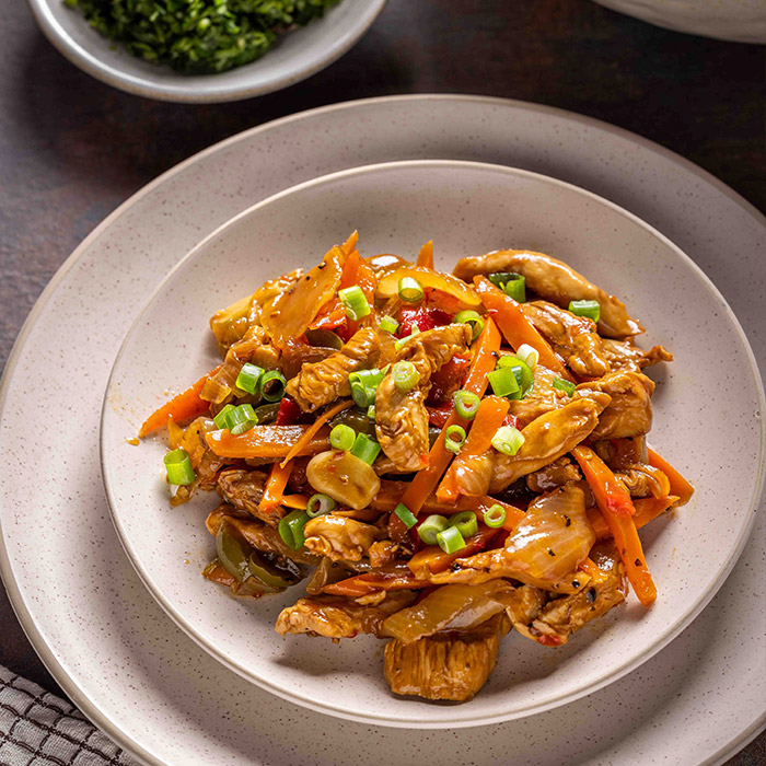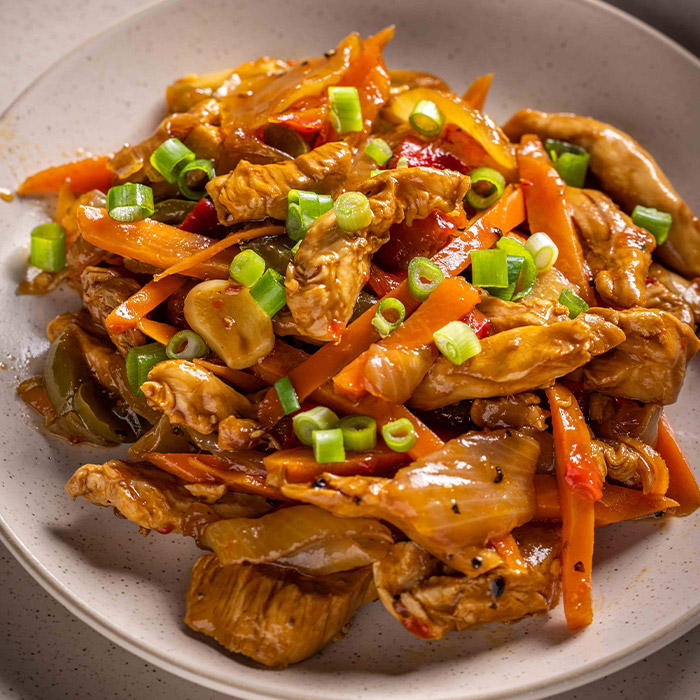 רצועות חזה עוף מוקפצות עם ירקות בסגנון אסייתי.