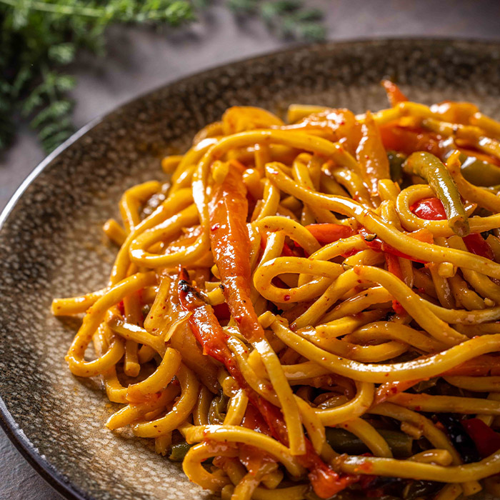 איטריות נודלס ביצים מוקפצות ברוטב צ’ילי מתוק עם שעועית ירוקה שלמה, תירס גמדי ובצל.