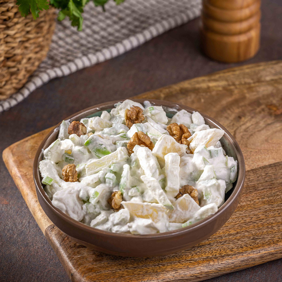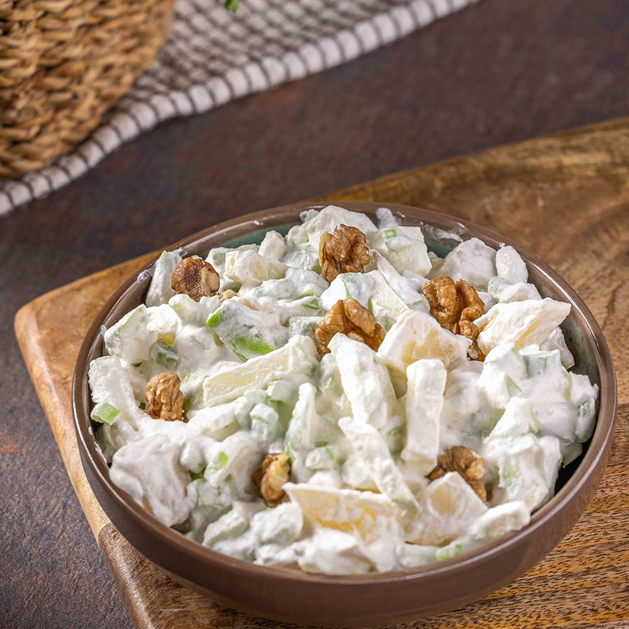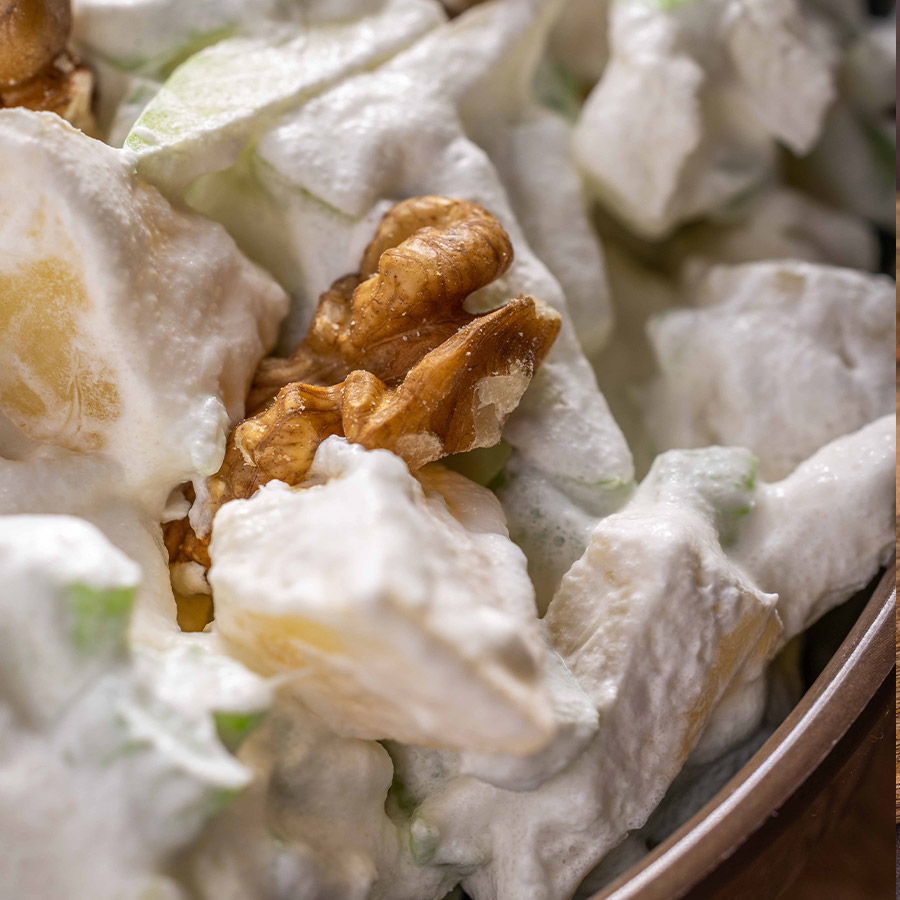 סלט תפוחי עץ, אננס, אגוזי מלך וסלרי בשמנת צמחית.