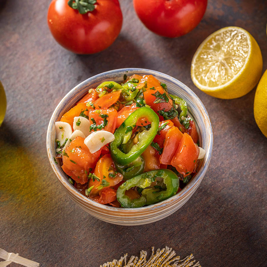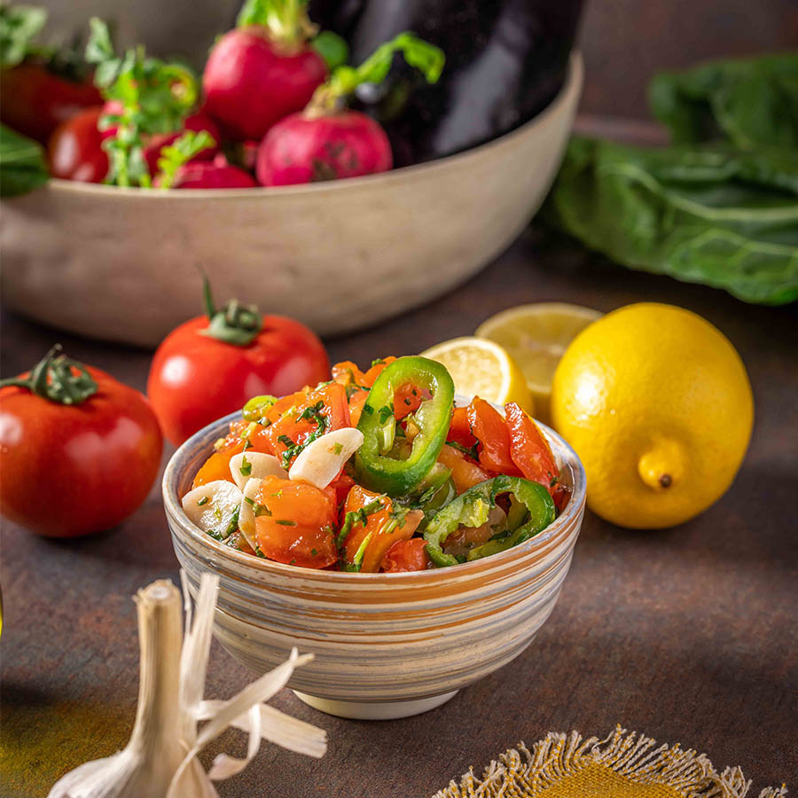 קוביות עגבניות טריות, שום, פלפל חריף בשמן זית, לימון ופטרוזיליה.