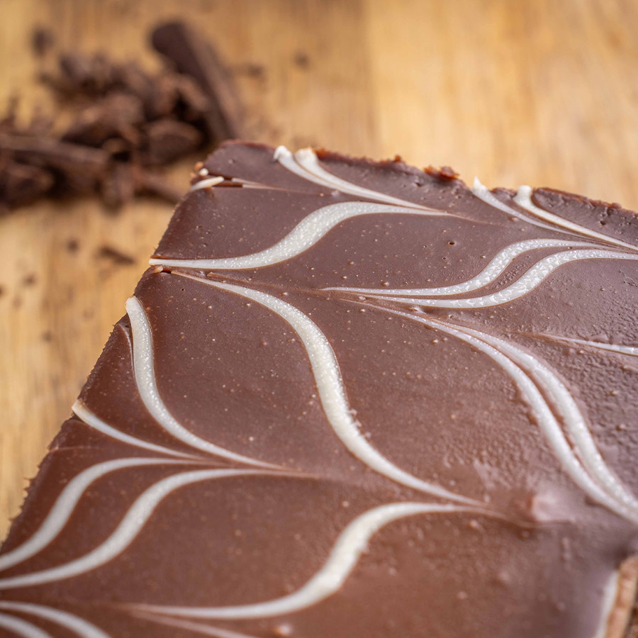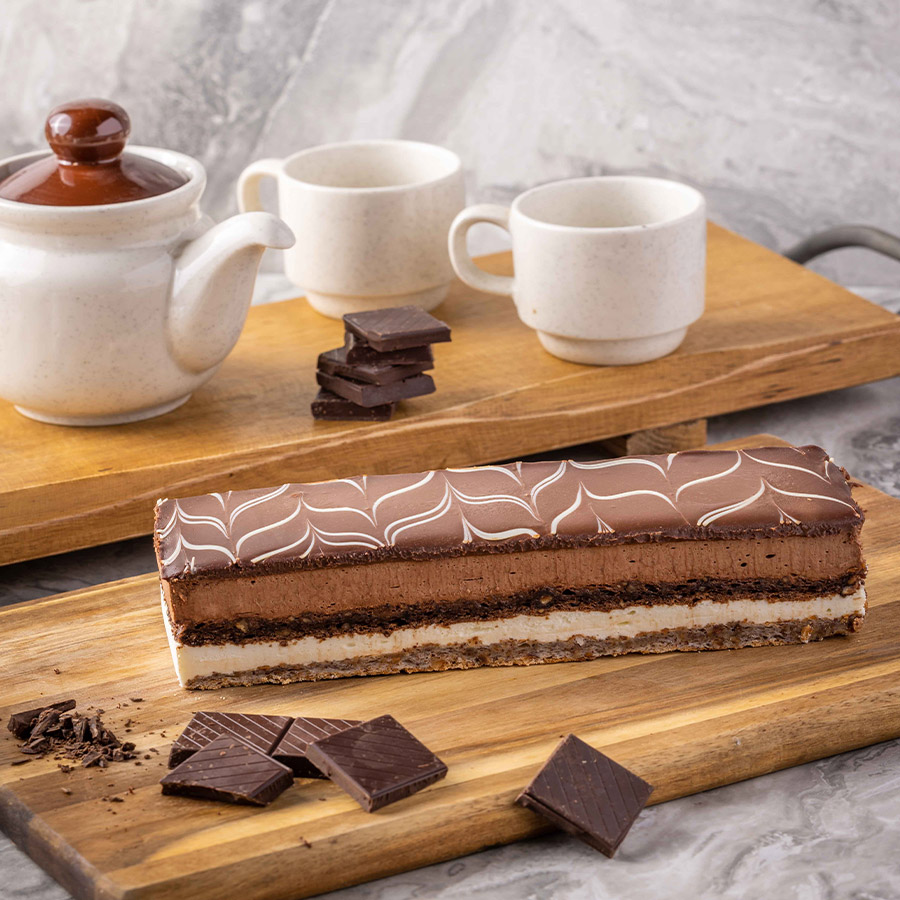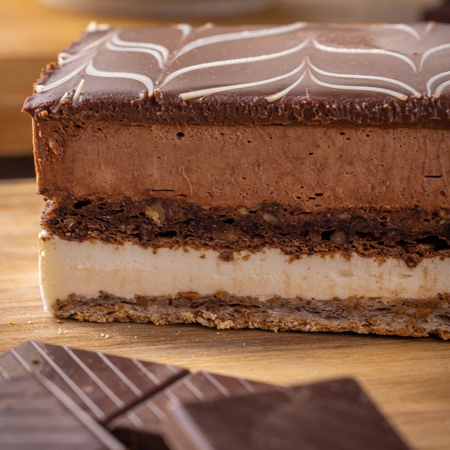 שכבות מרנג אגוזים ומרנג שוקולד אגוזים וביניהן שכבות של קרם שוקולד לבן, קרם שוקולד נוגט בציפוי של גנאש שוקולד חלב