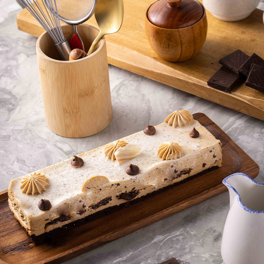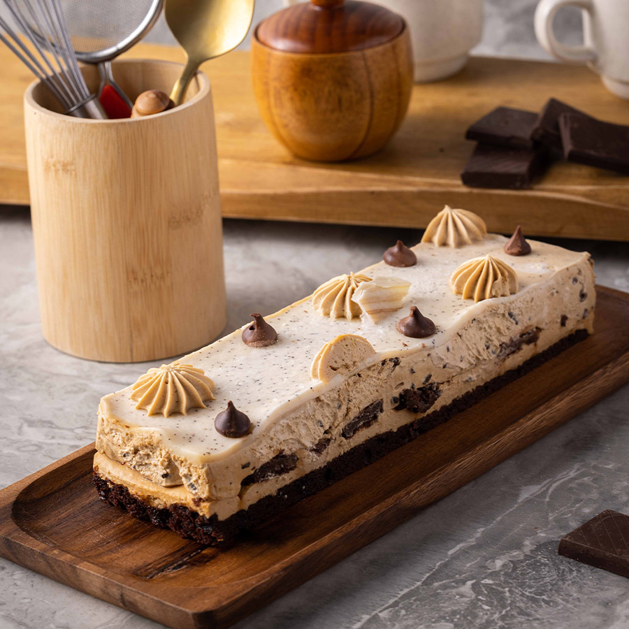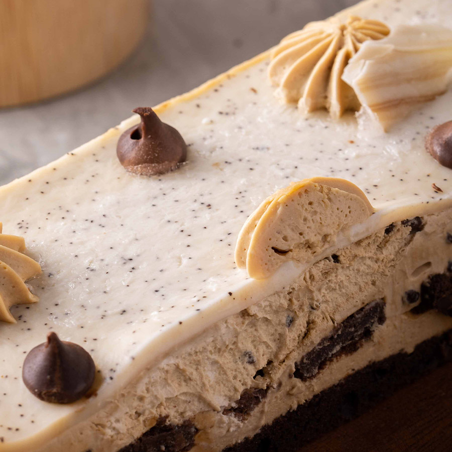 קרם ריבת חלב, שברי בראוניס ומייפל, וקרם קפה עדין, על בראוניס עשיר, בציפוי של גנאש אספרסו