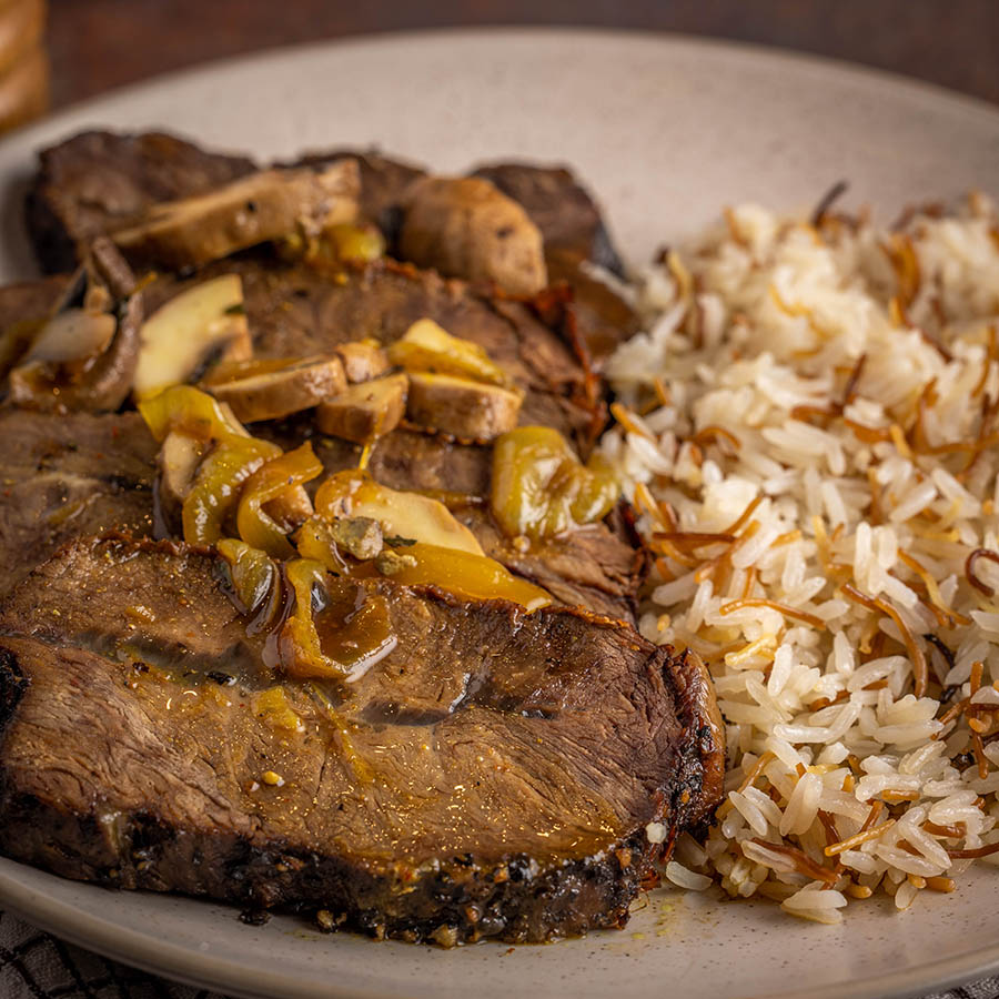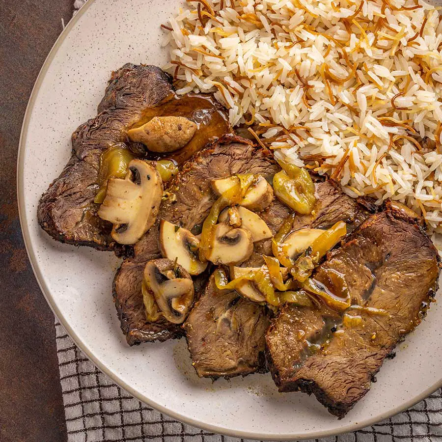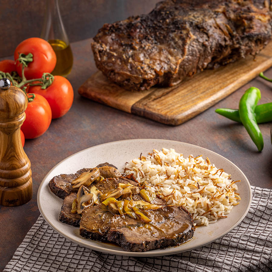 בשר צלי נימוח ברוטב פטריות ובצל מטוגן.