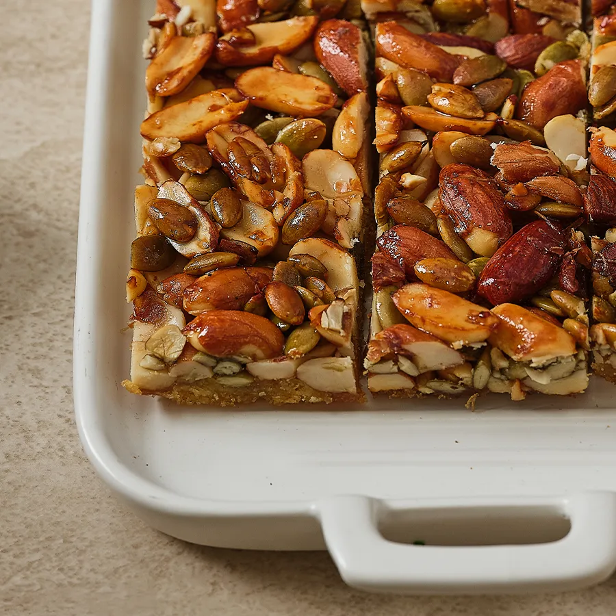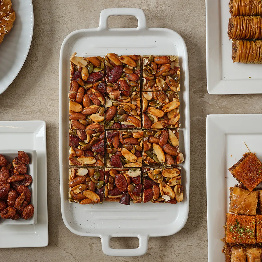 עוגיות מתוקות של תערובת פיצוחים על תחתית של שערות קדאיף.
