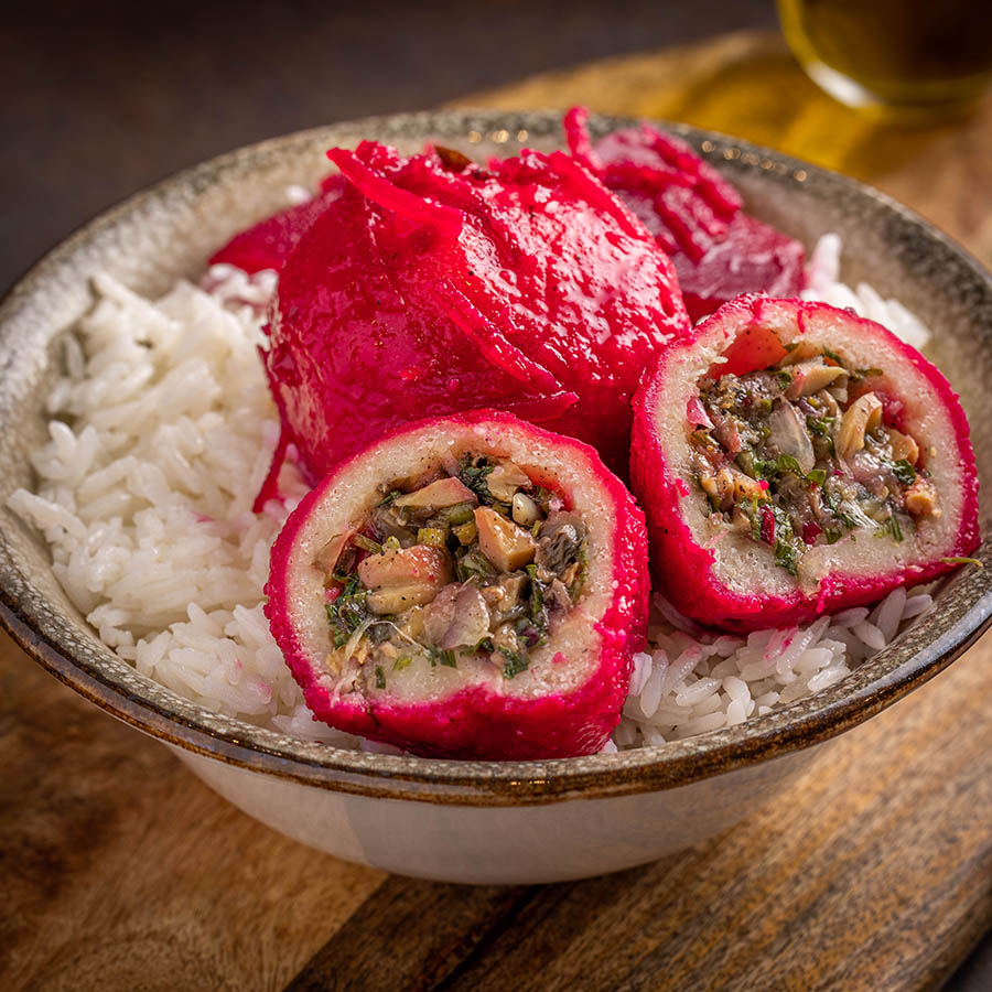קובה סולת ממולאת בפיטריות וירק מבושלת במרק סלק.